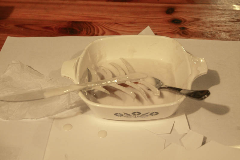 4. Papier mache that bad boy. Just mix some flour and water til you get a mud-like consistency, then cover the rib-cage piece in gloppy pieces of paper. Let it dry a couple hours, or put it in the oven on the warm setting for half an hour.