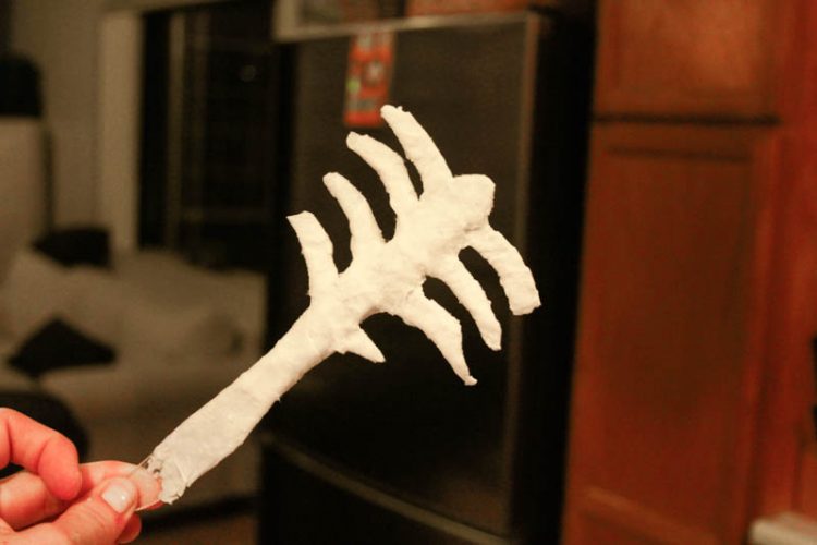 9. Once those are dry-ish, stuff them into the bottom of the rib-cage area. They’re his intestines, and they should be spewing out. You could even give him one of the ends to hold in his hand or in his mouth, for extra horror and violence.
