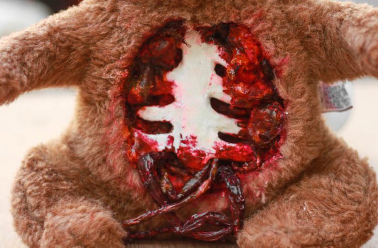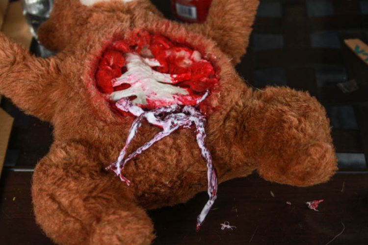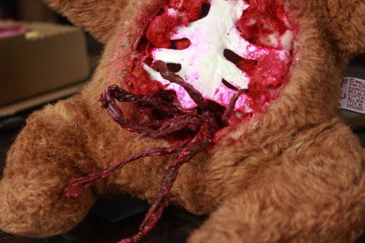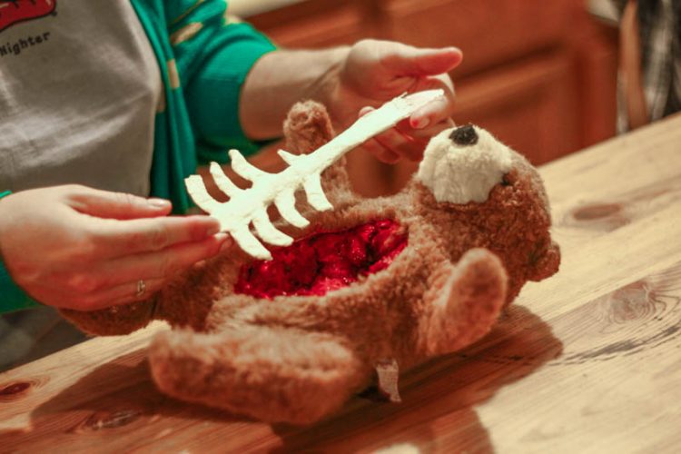 5. Cover the inside of the teddy in mod-podge or glue to make it a bit stiff. But make sure you don’t use so much that you can’t still push around the inside stuffing (for getting the rib cage in there). Then cover it in red paint.