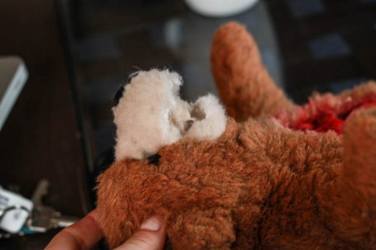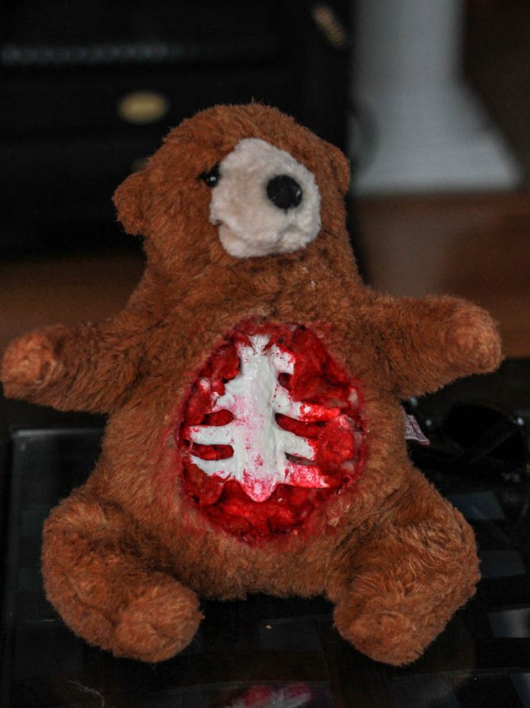 1. Cut the teddy open down the center (ouch). Remove a bit of the stuffing right in the center.