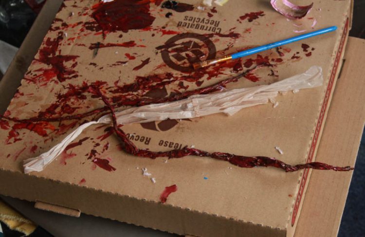 8. Cover those in mod-podge or glue, twist them up and let them dry. Then paint them with a dark red paint. It’s better if it’s a different shade of red than the red of his chest cavity.